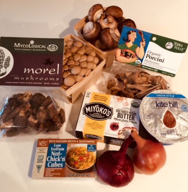 Heat a large skillet over medium high heat. When the skillet is hot, add the olive oil. When the oil is hot, add the shallot and red onion and sprinkle with 1/2 tsp salt. Sauté until translucent. Add the morel/porcini mushrooms and their liquid, Miyoko’s butter, and the enoki and crimini mushrooms. Sprinkle with 1 - 2 teaspoons of sea salt. Sauté until the mushrooms are soft. Add the remaining water, the sage, and the Not Chick’n Cube block. When the water comes to a boil, turn the heat down to low and simmer 10 - 15 minutes, stirring occasionally.